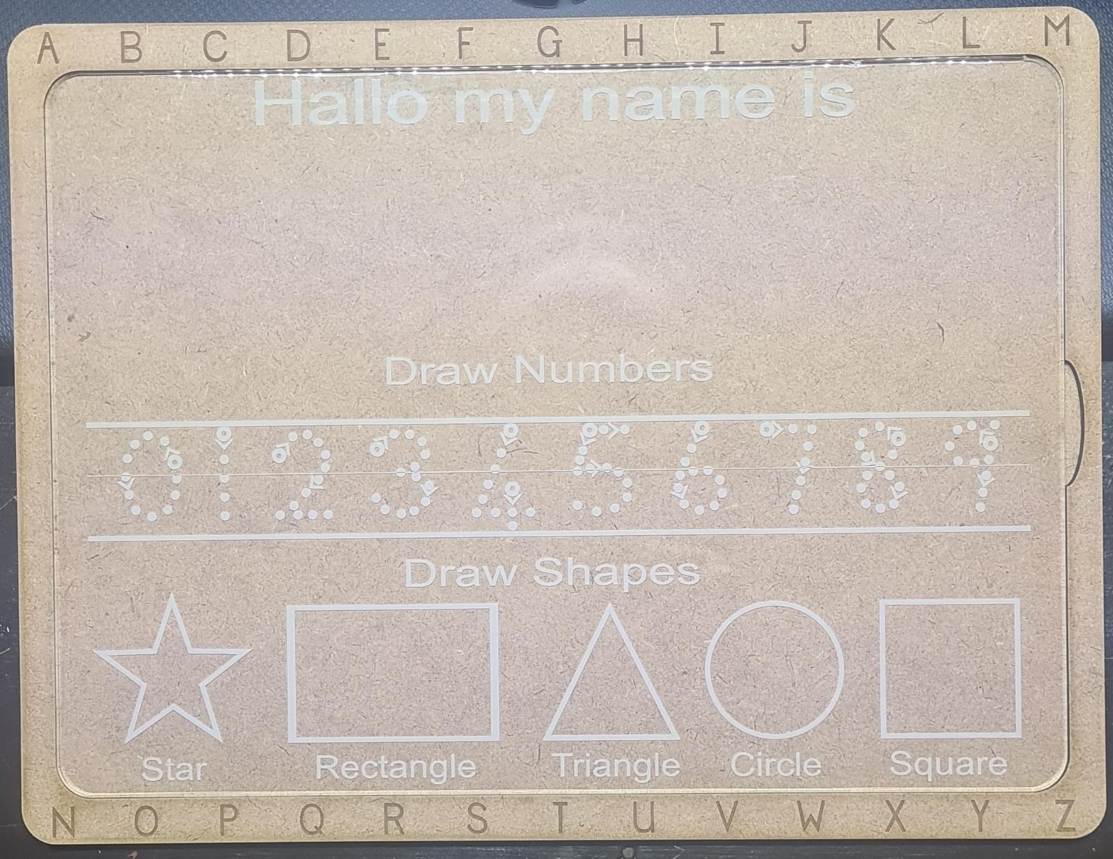 A writing board for teaching children to write. The name can be permanently engraved or added to change the name.